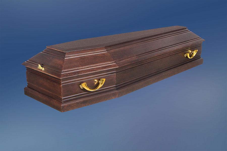 Гроб изготовлен из массива сосны и покрыт лаком. Ручки входят в комплект.